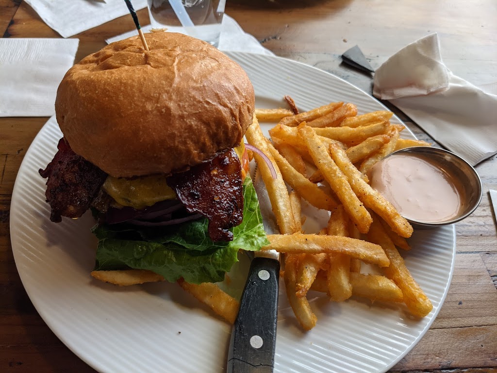 What a pleasant surprise! I stopped in at the Oak Barrel late afternoon. It was a cool oasis on a hot day. I tried their Paloma which was made with some fresh mint. It was delicious! Their Salmon Ciabatta Sandwich was also very tasty. The sandwich had a generous portion of nicely cooked salmon that was perfectly seasoned. I chose a side of fries that were also delicious. Anthony recommended the Guinness Chocolate Cake for dessert. The cake was not overly sweet and was served with vanilla ice cream. I couldn't have asked for better service. Anthony took great care of me - he checked back with me to ensure I was enjoying everything. Kudos to the Oak Barrel of Eagle for a great experience!