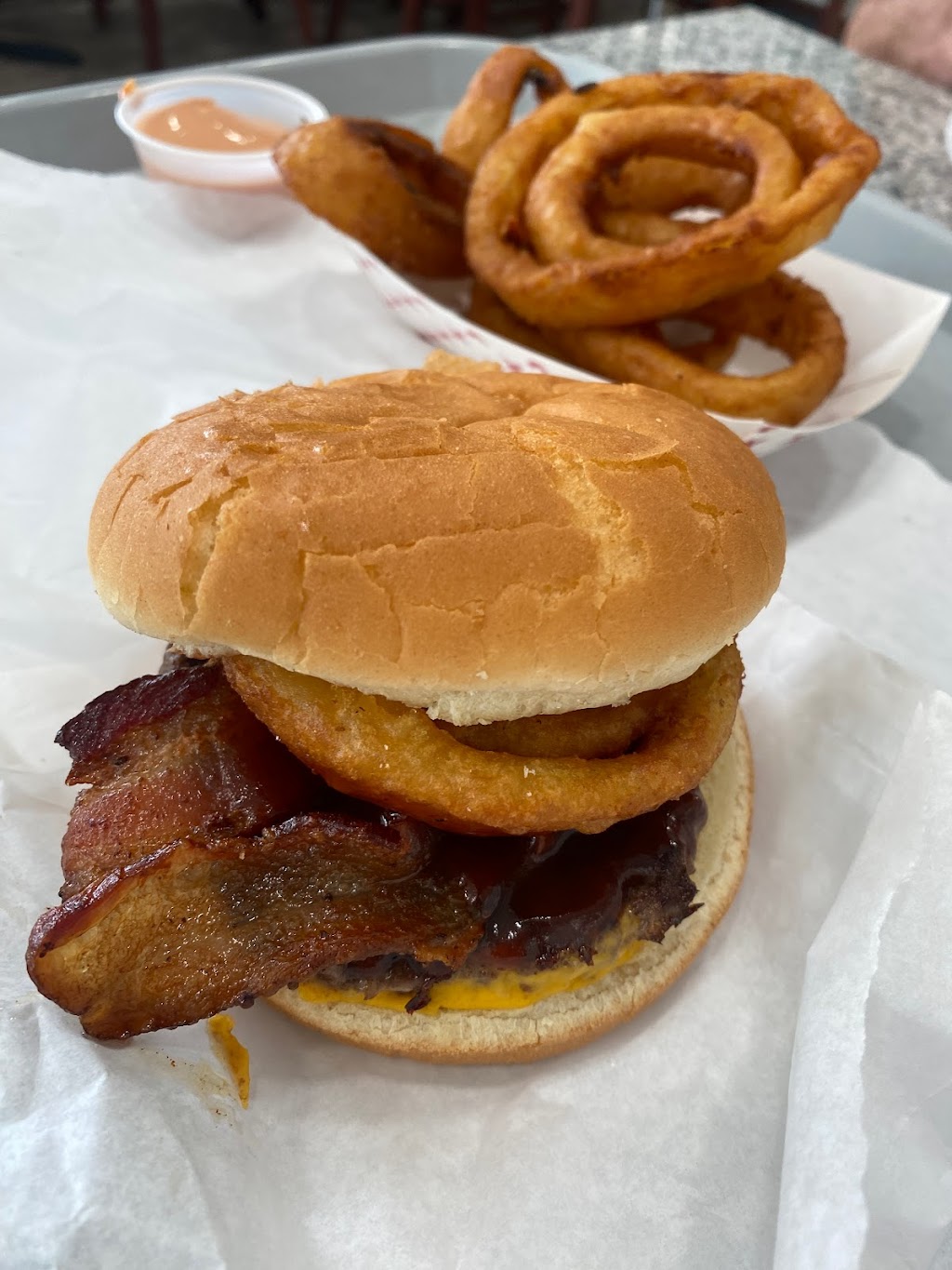 First time here. We ordered two different burgers and some onion rings.