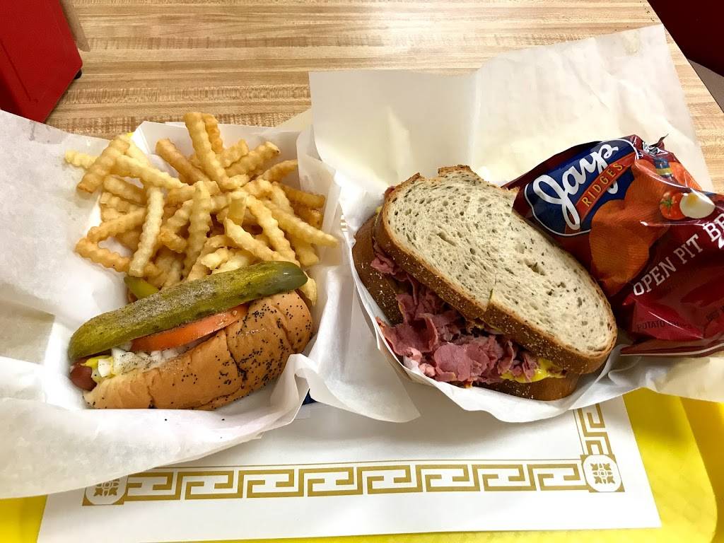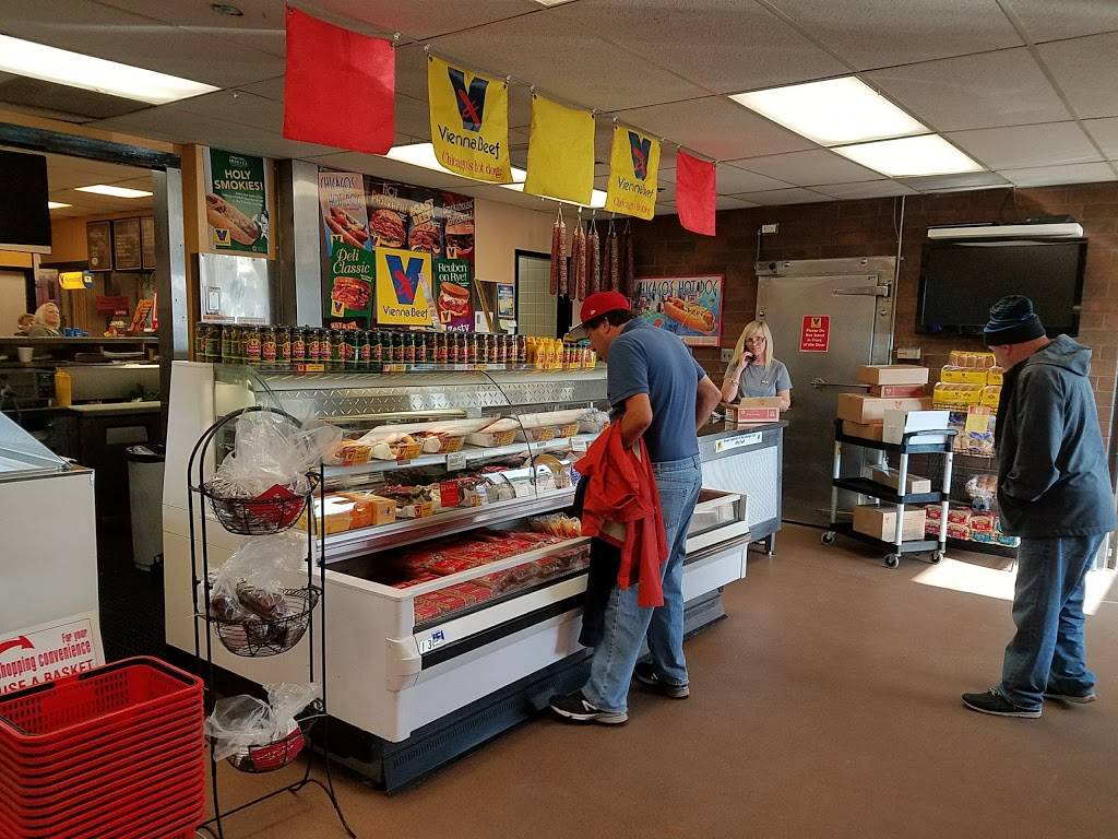 Delicious Chicago style hot dog. 2 hotdogs, fries, and a soda,$7.99. Wonderful staff. We bought 2 bags of Vienna hot dogs that were frozen and considered seconds....$15.00 for 10 pounds...great deal!