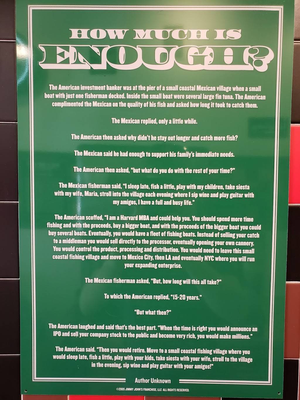 Typical of all Jimmy John's. - neat and clean restaurant - good sandwich.