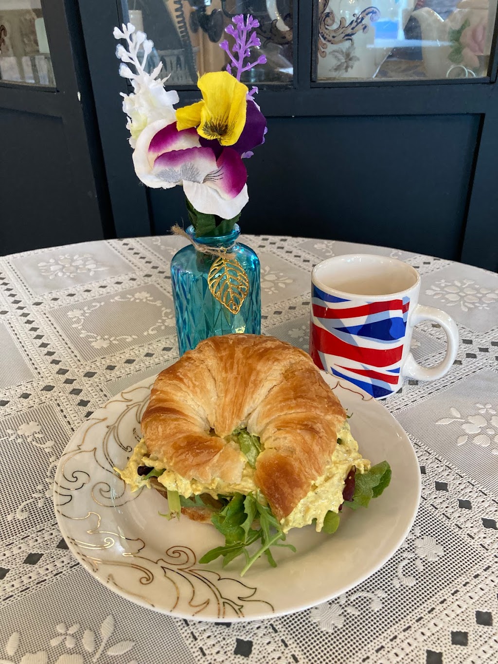 I met a friend here for lunch and tea, and it was delicious and cozy. We shared a pot of gingerbread chai tea that was lovely… no sweetener or cream needed! I had a chicken salad croissant and arugula side salad (I can’t remember what they called it). Both were fresh and tasty. My friend enjoyed a cucumber sandwich on gluten-free bread along with fresh berries. We enjoyed scones for dessert with heavenly clotted cream and lemon curd.