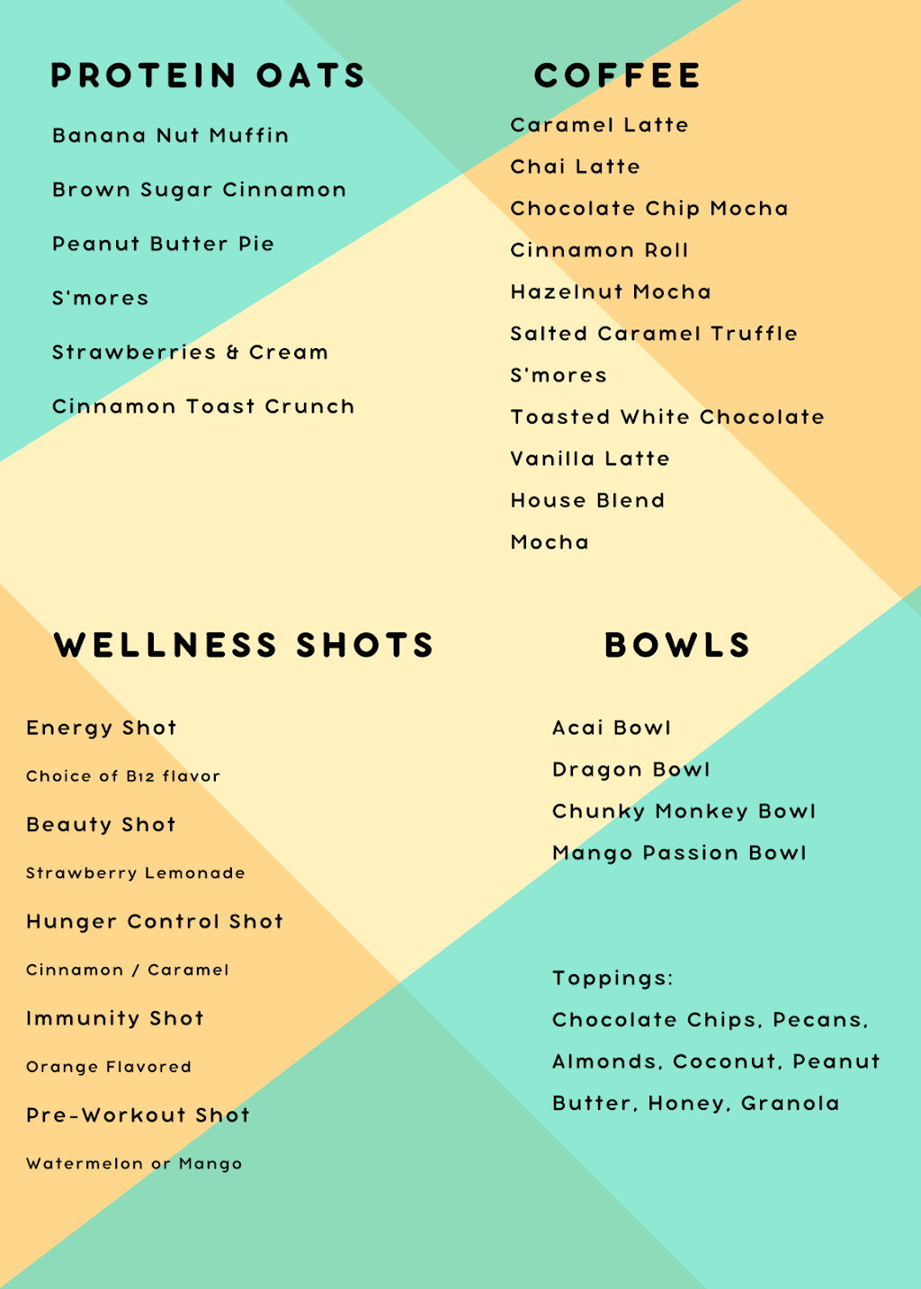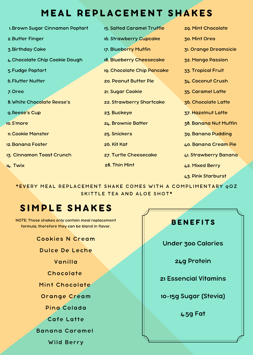 I have ordered from here twice for delivery and both shakes were delicious. One was the aloha and the second was a salted caramel truffle. Each shake comes with a complimentary B-shot skittles tea, it's full of B vitamins and is not bad at all. You also get a small "shot" of aloe that you can add flavors to. I have tried the mango and mandarin flavors and enjoyed both, they also have cranberry. If you order 3 or more shakes they do deliver. A delicious way to get a boost of extra vitamins and protein.