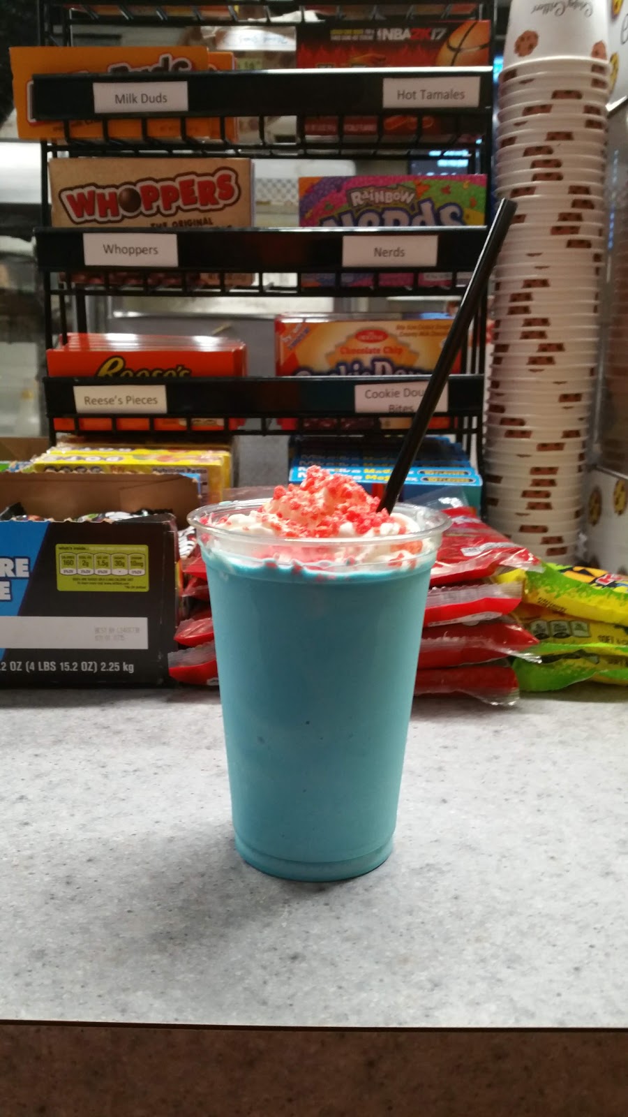 Great food from candy, pretzels, nachos, hot dogs, pizza, tenderloins, fried Twinkies, even Ice Cream and of course Soda and Popcorn! All at a very reasonable price.