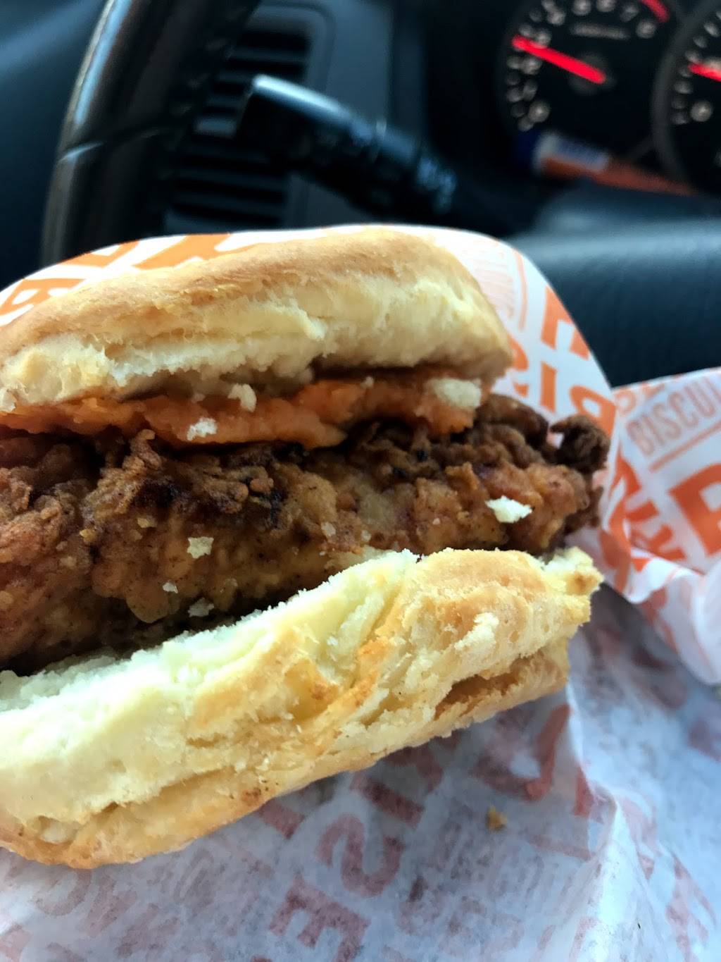 I have been wanting to go this place ever since seeing it was moving in. Before school was looking for a place to grab a quick breakfast didn’t know about this place was like but online it look quick. It was order by the counter style you get a choice of ordering from a tablet or person. I just got there simple chicken biscuit with an added sweet potato spread because that sounded amazing!! It was used instead of sauce right in the biscuit. Anytime I get chicken and mash potatoes I make myself a sandwich like this but by using yams instead it gave a little sweetness to the crispy chicken. Not only will I be back again to eat in the clean inside or patio seating I know I can get something quick if I don’t have a lot of time. Love it!
