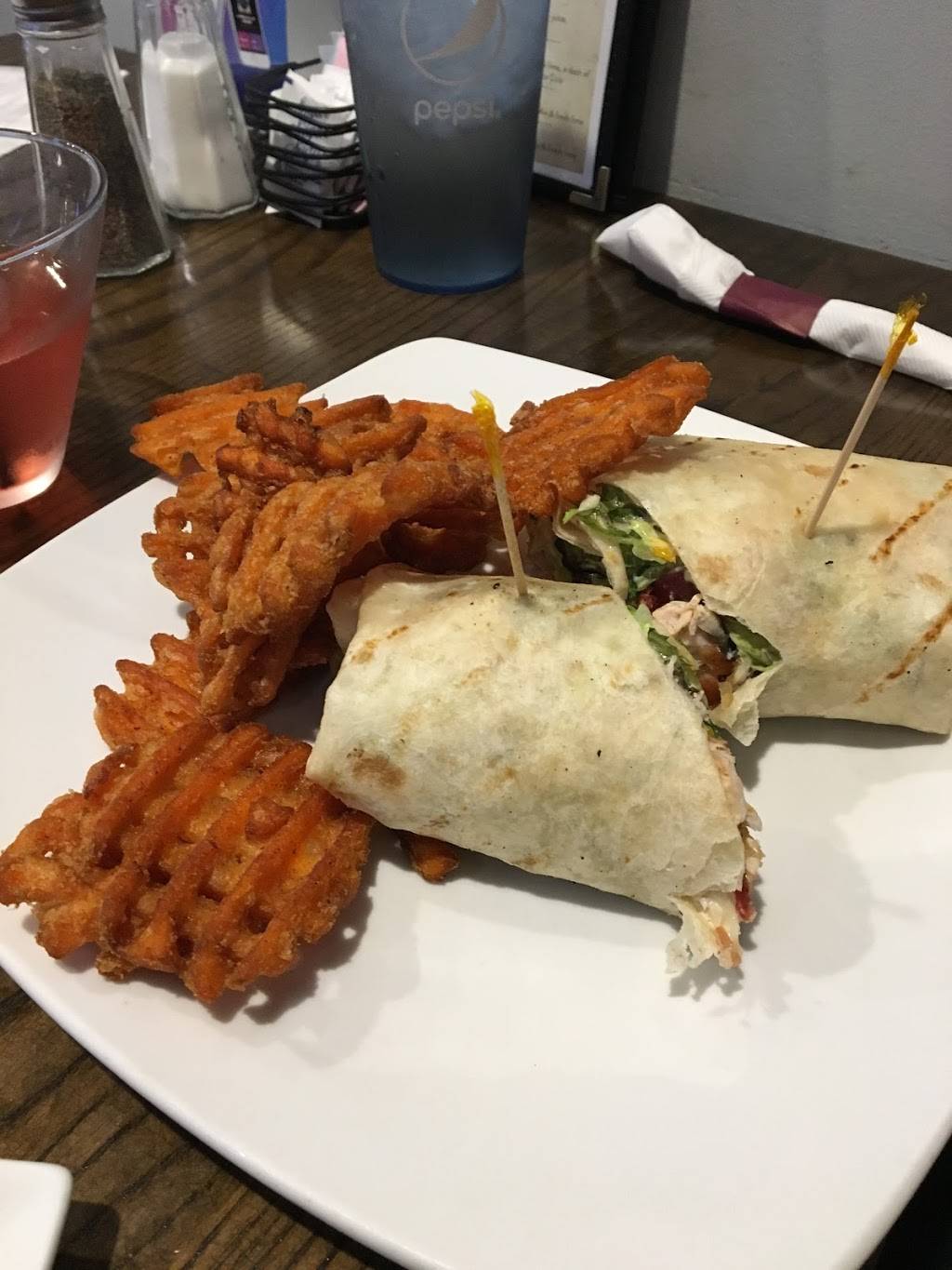 Great sports bar. Lots of big screens, the waitress even put the hockey game on for me. Good food, I had some sort of BBQ, can't remember. Lots of beer taps, full bar too. Service was excellent. Try this place, you will like it.
