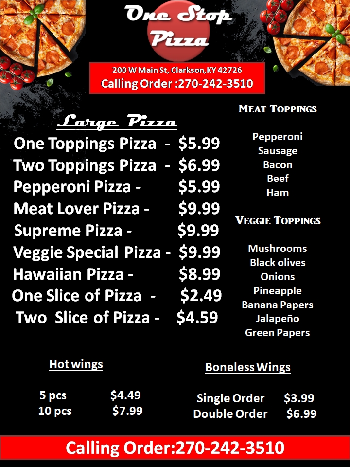 You can review this Business and help others by leaving a comment. If you want to share your thoughts about One Stop Pizza, use the form below and your opinion, advice or comment will appear in this space.