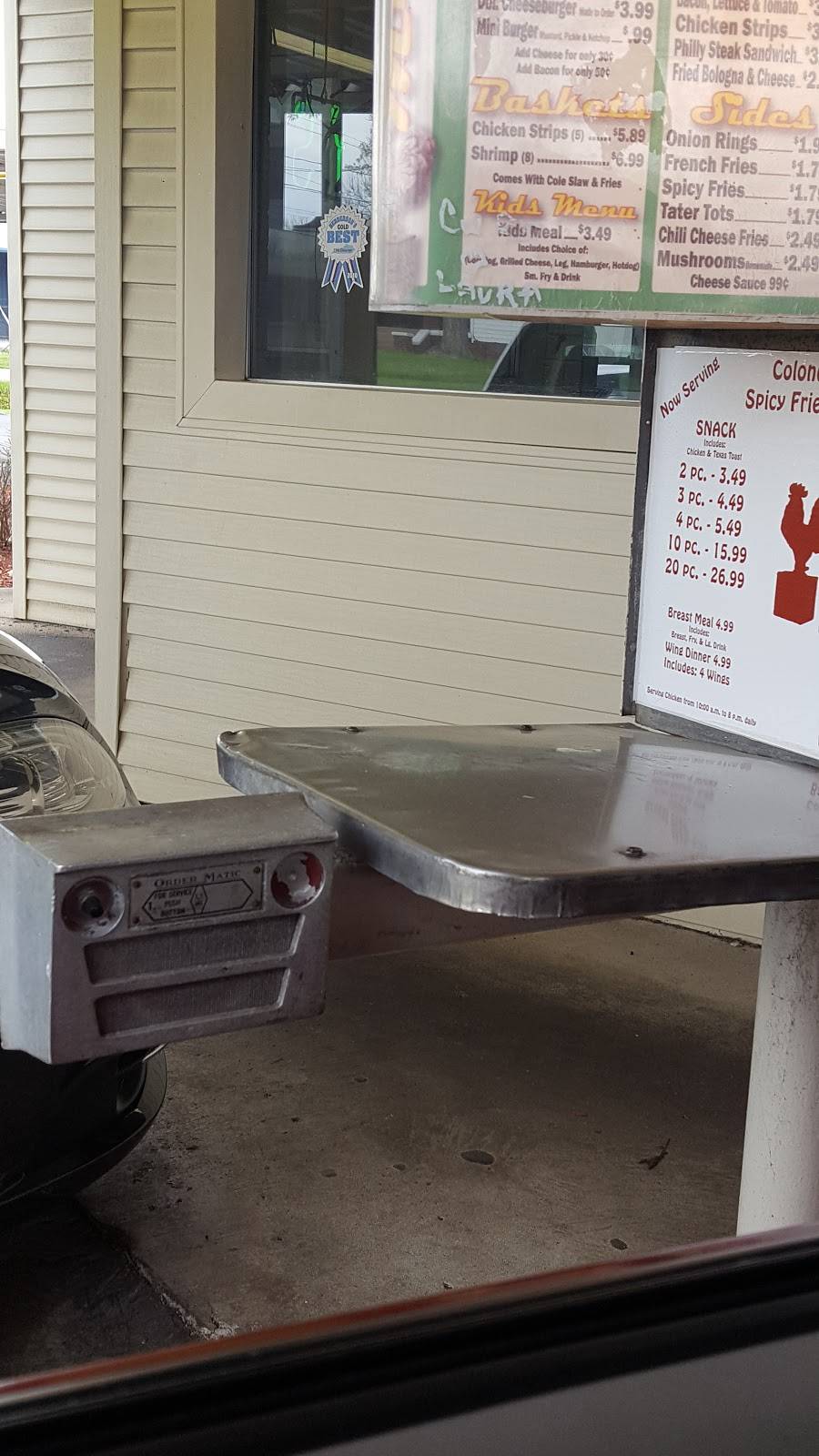 We ordered the Colonel Jim's famous recipe, spicy chicken. It really tasted the same as Colonel Jim's. It was brought to our car freshly cooked, fries were hot as well. Very satisfied with the meal, but the girl taking our order was rushing through it, and not the most pleasant person to be taking orders.
