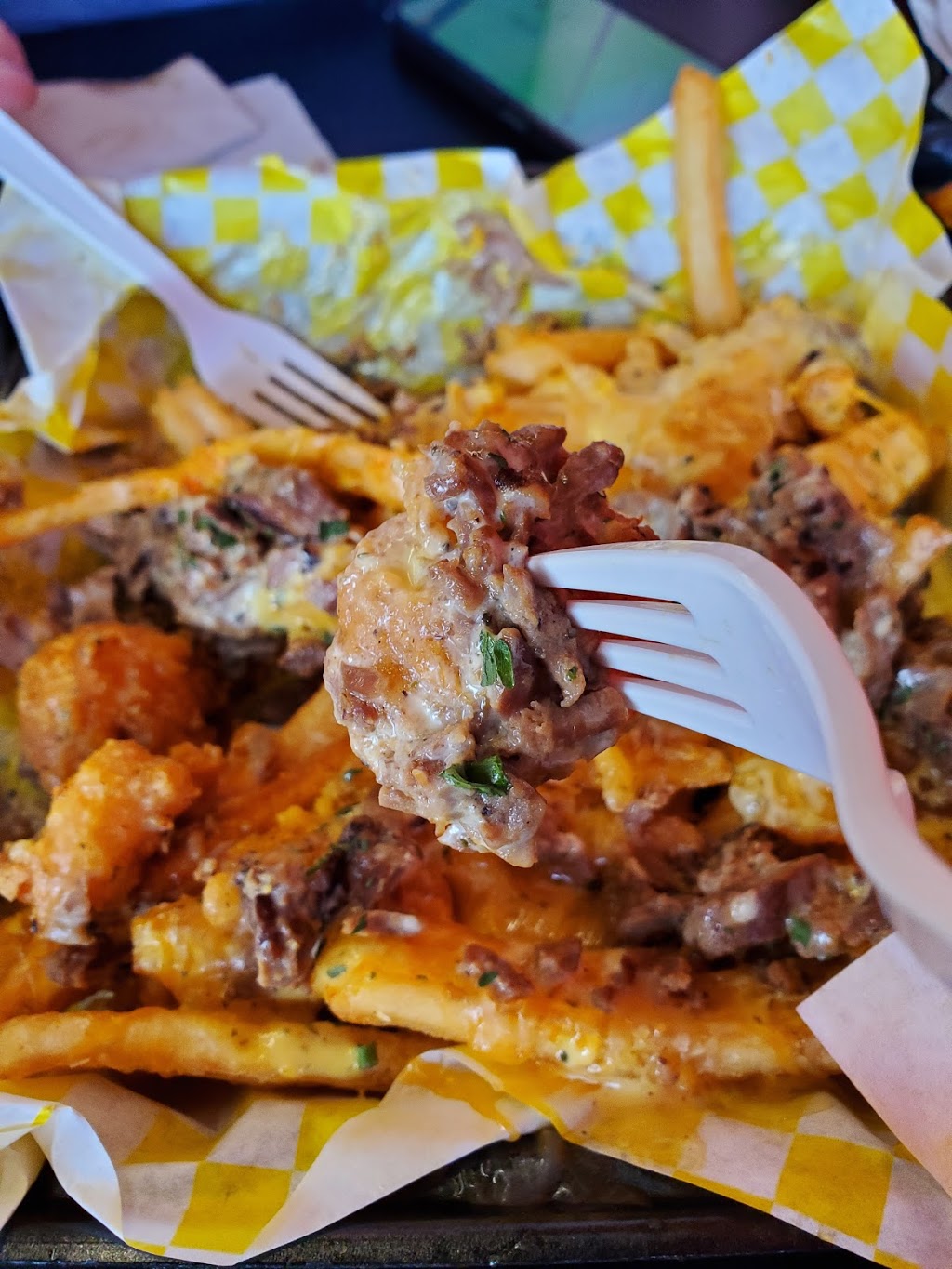 It isn't often you get to enjoy a nice meal while having a nice conversation with the owner of a business. It was so awesome meeting one of the owners!! My dad and I split lemon garlic fried chicken fries with extra sauce, bacon and hot peppers. Was fantastic. We will be returning.