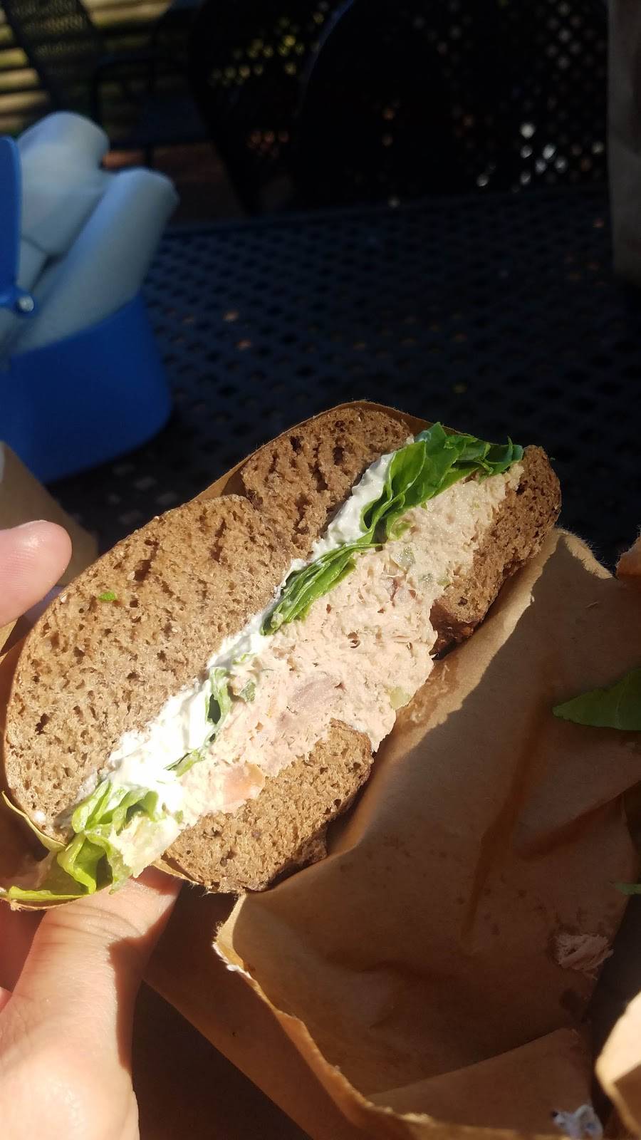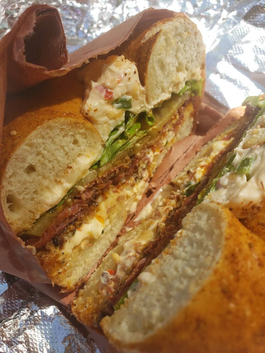 Just had the best bagel of my life. Pastrami bacon, pimento cheese, pickled green tomato, lettuce, on an Old Bay bagel