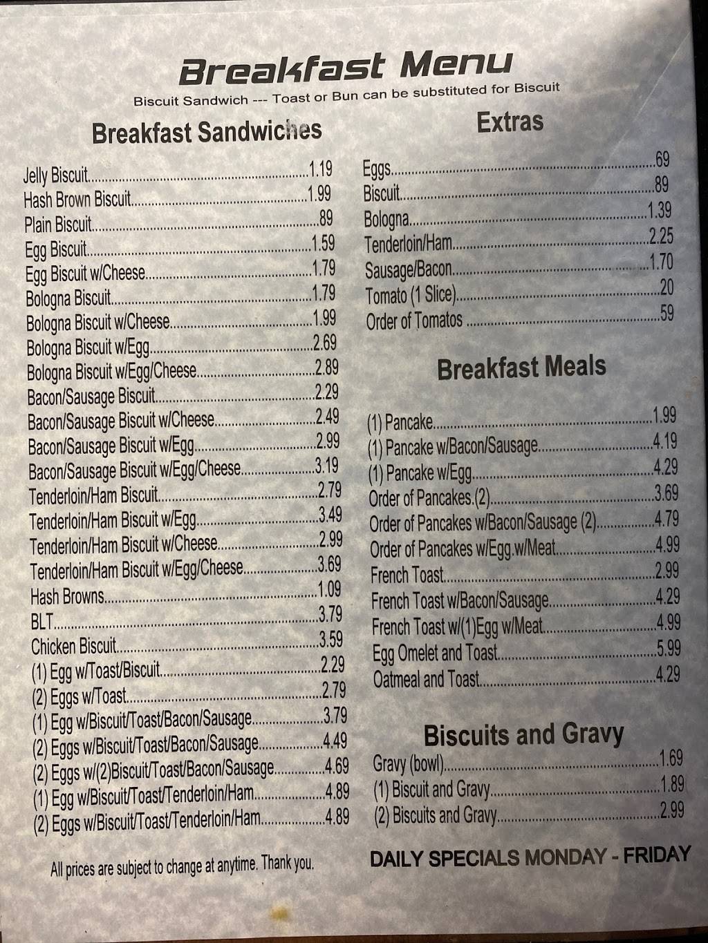Good breakfast. Bad hamburgers and coleslaw. Tried hamburgers again. Cold. Precooked. Better though