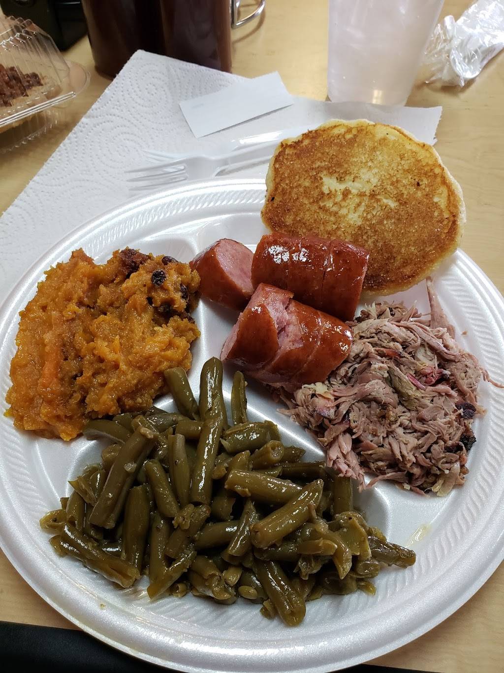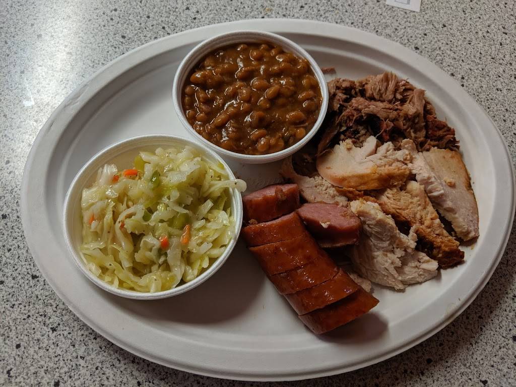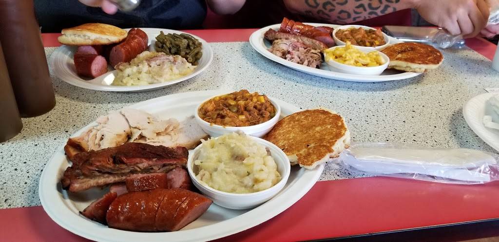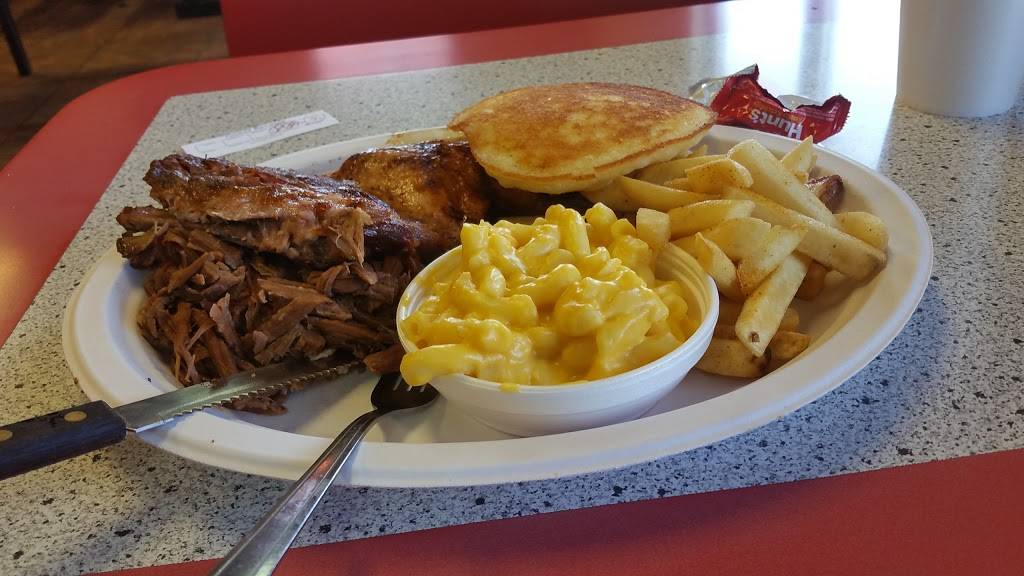 Good food for the price. Being from Louisiana I’m not use to flat cornbread. We got (2) 2 meat plates with 2 sides. The ribs , sausage and brisket were very good. The baked beans had a good flavor. The potato salad was ok. I like the fact that it is small place. Nothing fancy. Atmosphere has a country feel. People are very nice. If you are passing by I suggest stopping in to try the food.