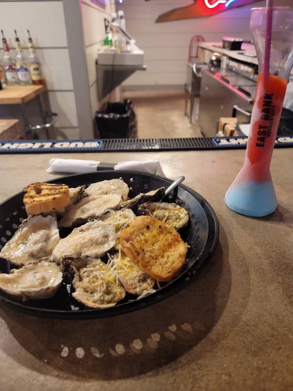 Food was great! Comfortable setting! Had a band outside playing. Tuesday is ladies night $5 Daiquiris. Food a little pricey, just a tad. Oysters are their specialty but I don't eat them. Would have been nice to have had other seafood options like a basic shrimp or catfish platter. Only 2 dessert choices. Bathrooms clean. Socially distancing tables for dine in. Patio available in the back. No much parking in the front.