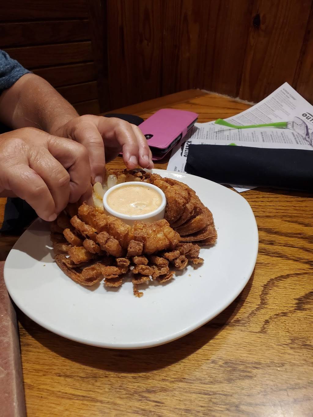 12oz T-Bone Steak & Baked Potato and Lobster with Baked Potato. Side of French Onion Soup. Appetizer Blooming Onion & Outback Steakhouse Rye Bread. All was delicious! We celebrated my husband's Birthday here on this day. Waitress was superb. I highly recommend this restaurant!