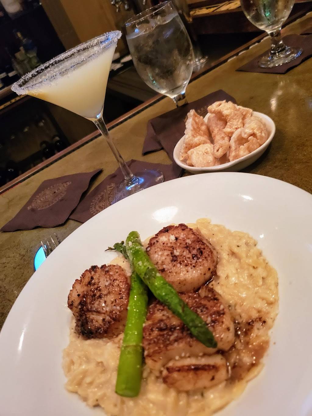 Food and atmosphere for both wonderful. This is a fine dining establishment and priced accordingly. The 14 oz bone in rib eye was fantastic mushrooms and sauce compliment it perfectly. V Pan roasted chicken breast was slightly crisp on the outside and super tender on the inside with the pesto butter was outstanding. We did not care for the cabbage it was a bit tart sort of a vinegar flavor. The crawfish fries for the appetizer was also delightful. The oysters Rockefeller soup Was enjoyed immensely by both of us comes with a Fried oyster on top. The white chocolate bread pudding and the chocolate pot de creme was probably 2 of the best desserts we have ever had had a restaurant. We had very good service and all of the courses came out perfectly timed