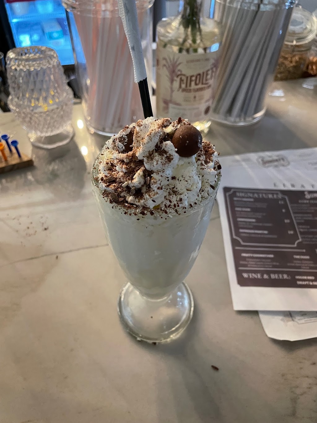 Fun soda shop with limited food menu, ice cream treats and libations