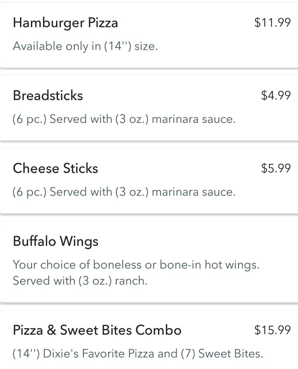 Ordered the Monday special on waitr and picked it up. Pizza was good and the dixie sweet bites are addicting. It was advertised with a cream cheese dip but I think we got a chocolate one. Dip or not they are good. Didn't get a pic of the pizza before it was gone.