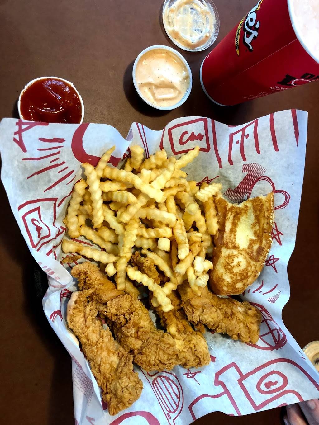 Best fast food chicken fingers. They have good crinkle cut fries too. Lemonade and sweet tea is good with their crunchy ice.