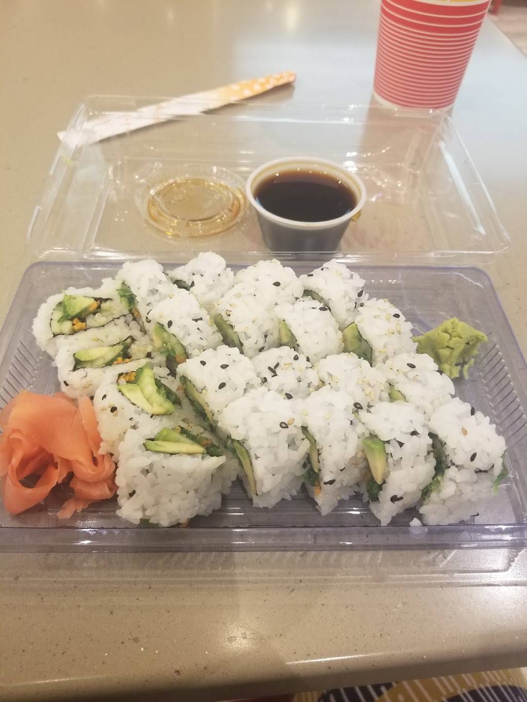 My friends and I got sushi from here as well as food from other places. They still let us sit down and eat there. Sushi was delicious. Tables weren't clean but they weren't really dirt either.