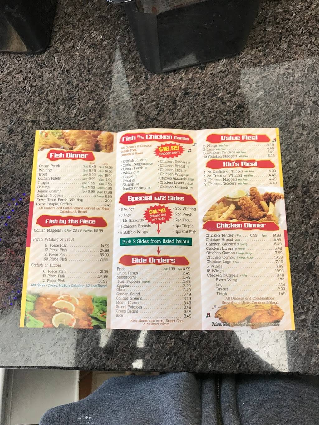We got two fish and chicken combos to go. You can pick how you want your chicken and your fish.The chicken (we got a breast and tenders) was spiced well and juicy. Our food was cooked to order and came out very quick. The shrimp were good. The catfish nuggets were also good but had fried chunks of bone in with the chunks of meat. The fries were average. Most disappointing part was that once we got our food home we realized the cole slaw that was supposed to be included in our combos was missing! That being said would definitely try again after they have been open a little longer.