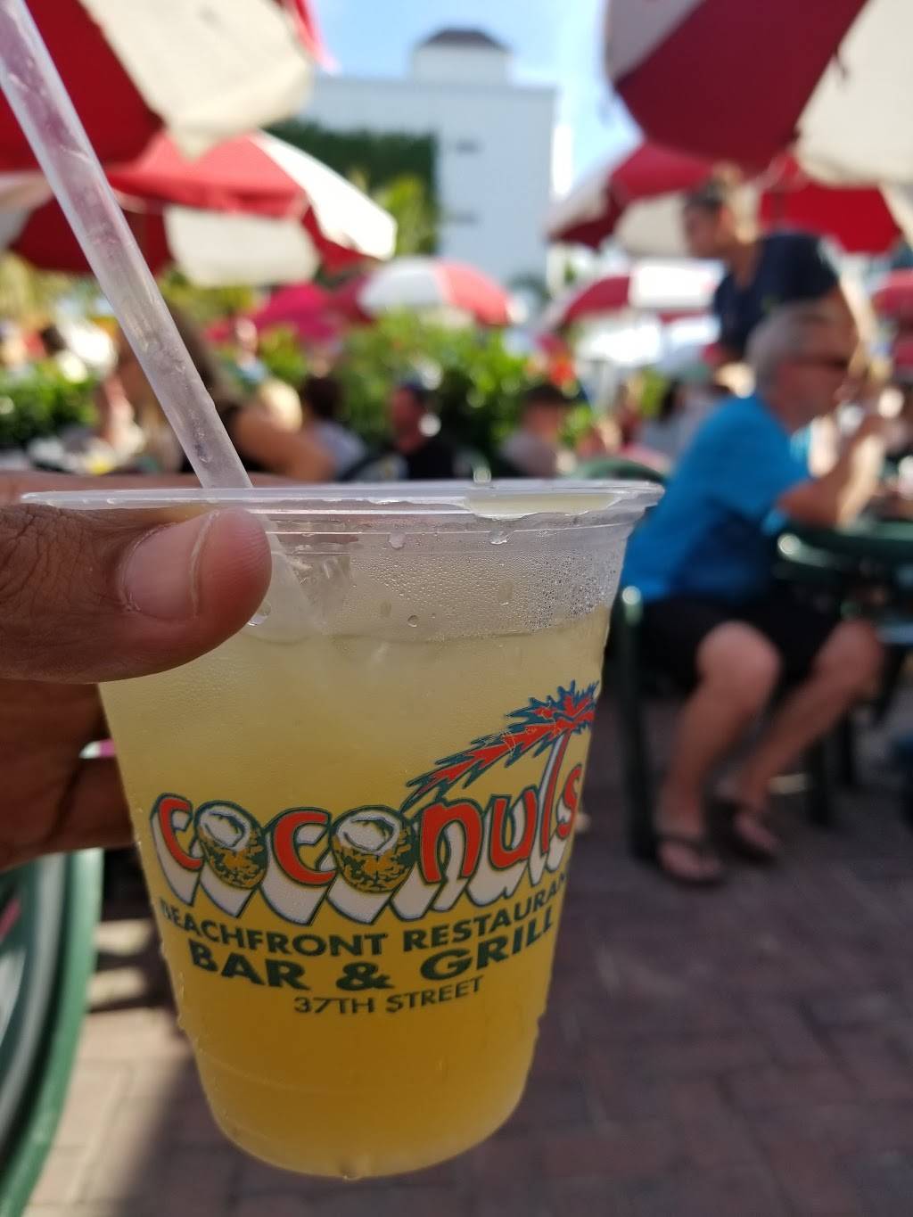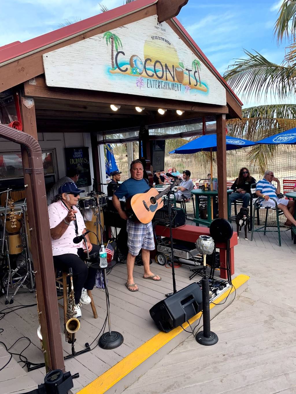 Wow! What a treat it was to get here after a long wet winter. We arrive just in time for the "Fastest happy hour on the beach". From 5:00 to 6:00 everyday two for one drinks. Coconuts is a large outdoor patio right next to the beach. A large dune blocks your view of the ocean, but the live music and fun crowds more than make up for the loss. The staff is fun and friendly and the live music is always welcome. I love the bean burger but my friends love the hamburgers as well.
