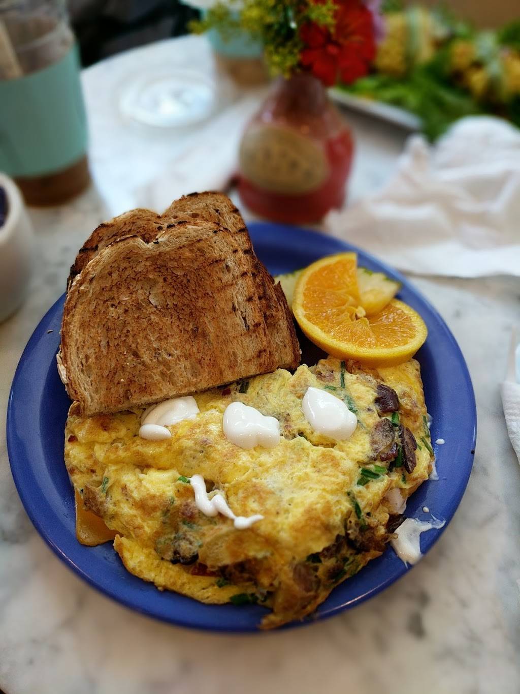 The food and the atmosphere were wonderful. The food was delicious and the cafe was decorated as quaint. Would recommend Among the Fliwers Cafe to everyone