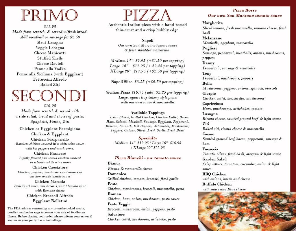 True Italian pizza. Rare to find in New England. Hand made pizza, home made sauce, abundant toppings. They also have Sicilian pizza and this is the first time in 20 years I have had Sicilian pizza outside of New Jersey. Beno makes a great pie. First time I ordered it I loved watching him toss the pizza and make them all by hand. Best pizza outside of Boston. You can't miss coming here.