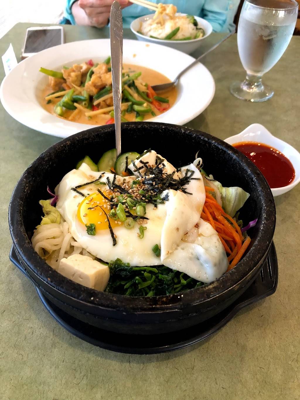 Amazing place. Definitely get the stone bowl Bimbab !! I got it with the beef both times I’ve been here and it was delicious, my girlfriend got it with the tofu and said it was good! Parking was easy to find when i came for lunch during weekday and a Thursday night. Never had a wait for a table. Also the Thai tea is worth it! There is vegan options too. Tasty good portions with reasonable prices!!