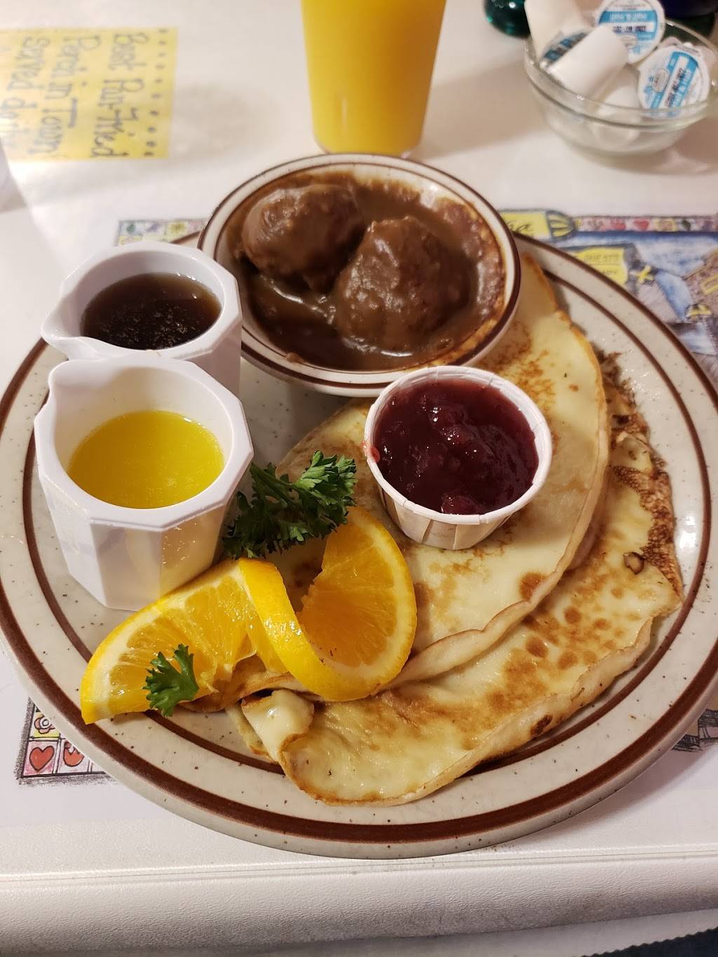 Swedish traditional flavors served with love. Super picky kiddo ate 2 orders of pancakes. The sampler platter was a delicious collection of Swedish specialties. Husband had the pancakes with meatballs. The restaurant was short staffed but still served us like we were top priority. (They could have been super annoyed but instead chose to be charming. Maybe that explains why the pancakes seemed amazing ?) The eclectic decor is cheery and had kiddo counting that birthday money burning a hole in his pocket. We felt very comfortable ... great road trip stop. Oh and very good coffee. The menu offered non-Swedish themed items as well, but we decided to go "all in" considering the restaurant. The bread was very good, a flavor and quality that are hard to find in other parts of the country.