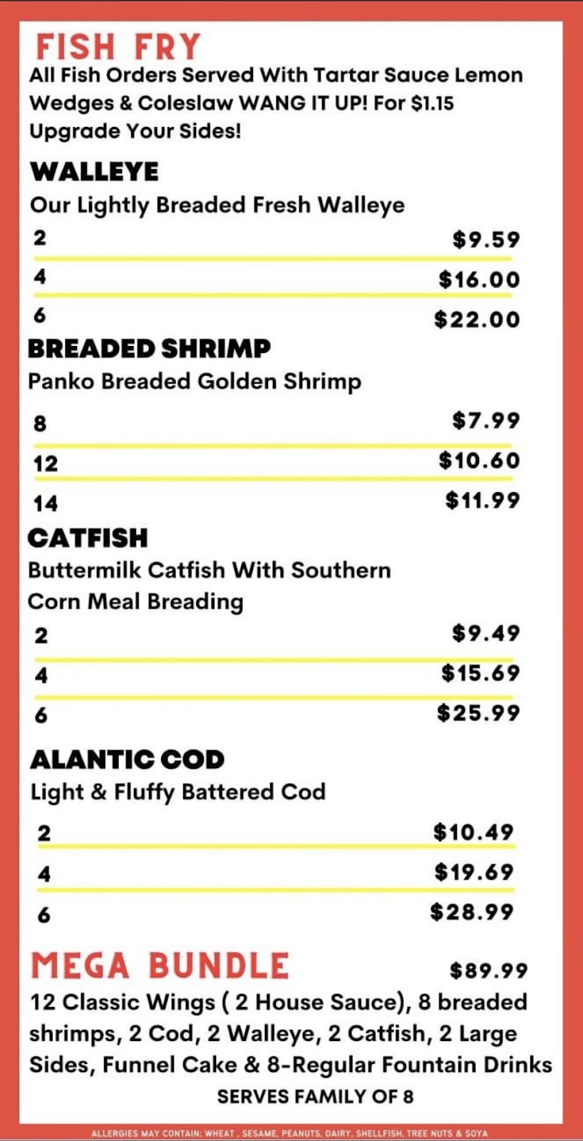 We stopped in and got 2 combos: wings & shrimp combo (6 wings & 6 shrimp) and the catfish combo. Each came with coleslaw and your choice of salad or fries. I dont know what they put in their Buffalo sauce, but it was delicious! Tangy, not too spicy and wasn't absent-mindedly tossed in too much sauce. The catfish has a southern cornmeal breading that was seasoned extremely well, not like the bland battered stuff most places in Flint use.