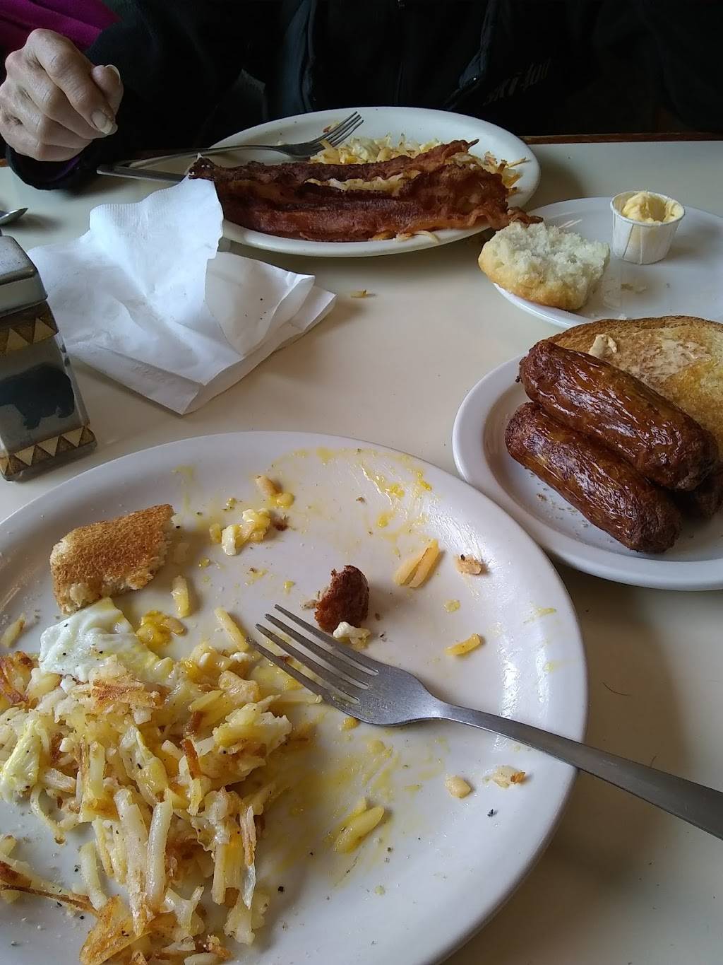 Good food, clean, reasonably priced and good coffee mugs that keep your drink hot. Salad is actually mixed greens not an iceberg leaf is sight. Waitstaff was friendly and effective. My only complaint is the pie crust. The pie filling in the Razzleberry Pie was so good but the crust was like corrugated cardboard. I’d eat here again.