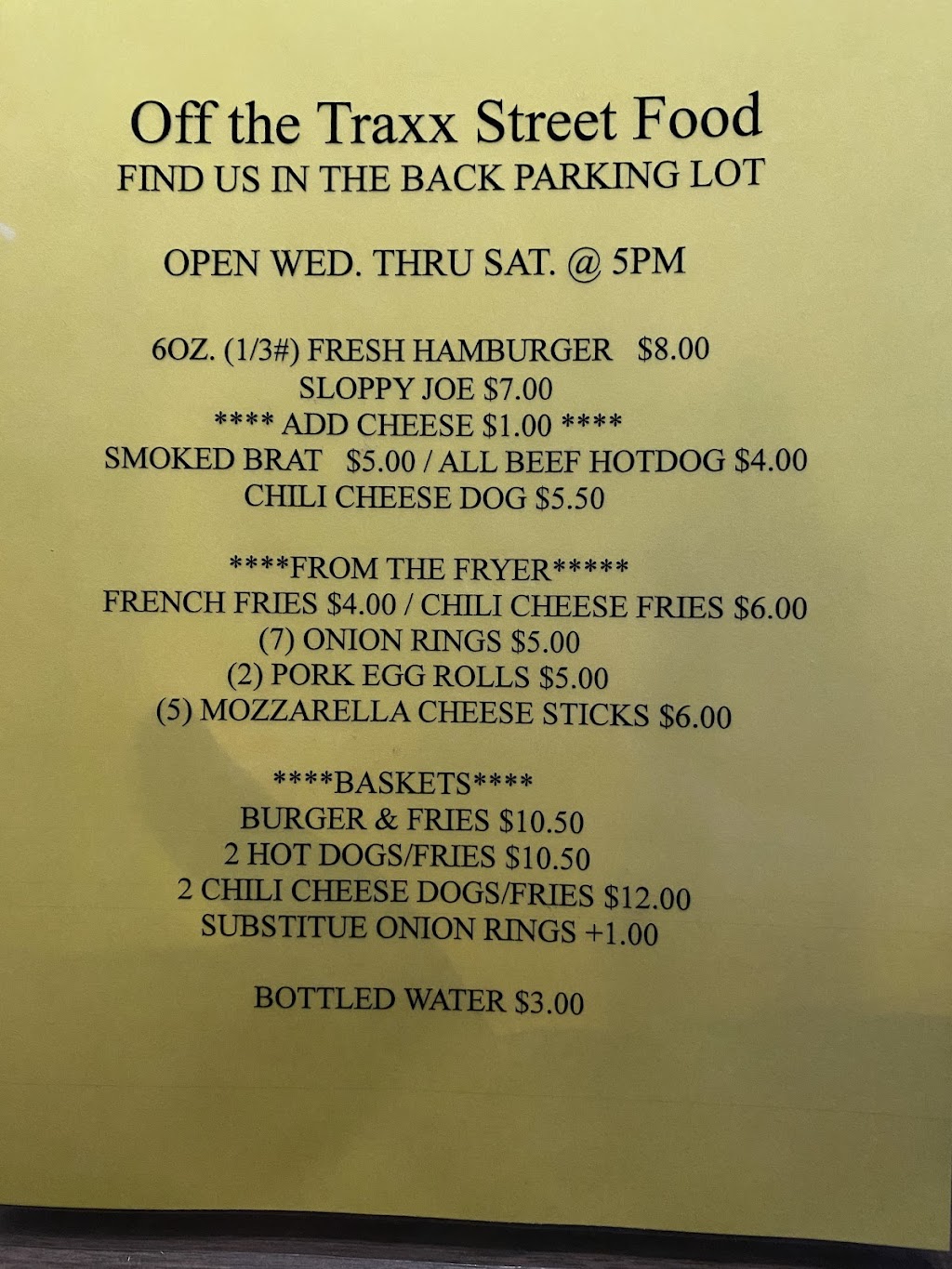 Fast and fresh food with extremely friendly staff, always with a smile on his face. I had the cheese burger loaded with all the toppings. And the eggs rolls. And French fries. All were delicious. Especially after a few drinks at side traxx which is right next to off the traxx. Perfect place to have drinks with friends and then get some delicious comfort food without having to lose your seat in the bar! Love it.
