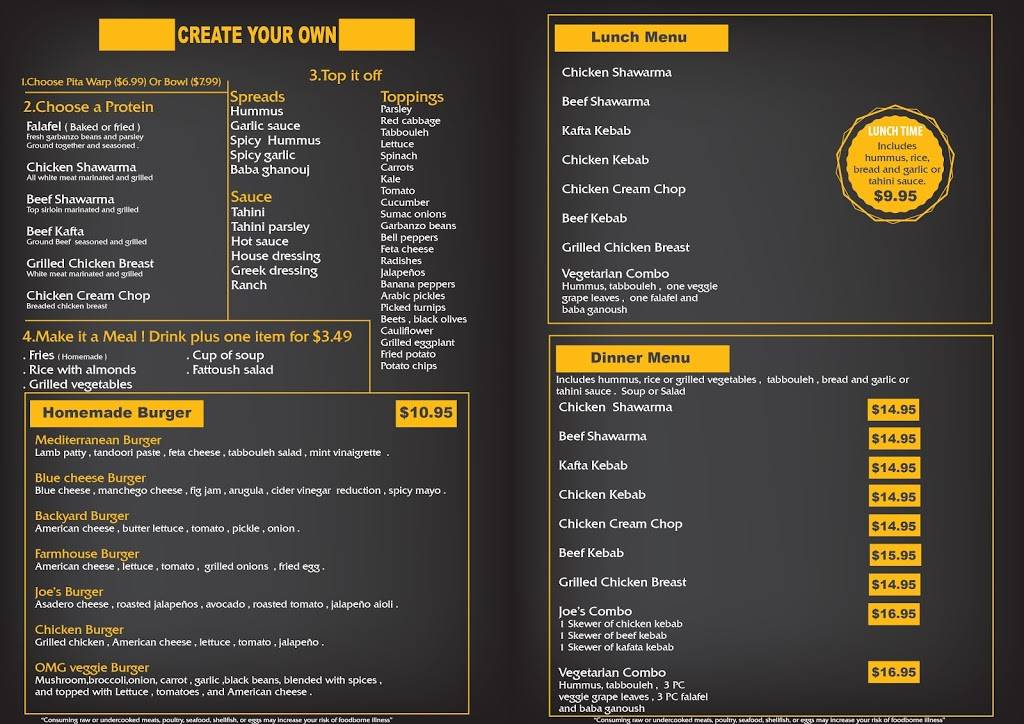 The great thing about Joe's grill is that it's connected to Hookah Joe's and they do allow food in at least from there, even though Hookah Joe's even though has a sign that says, "no outside food or beverages".