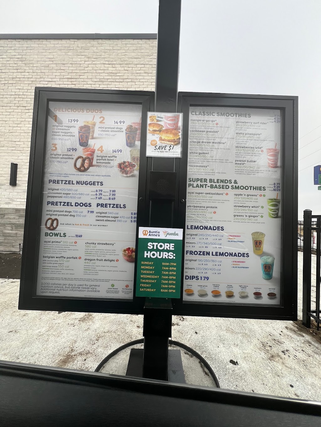 Drive thru is finally opened! Very cool store. Pretzel was warm and delicious - Jamba smoothie was great - real fruit.