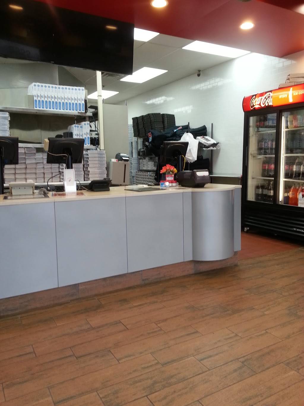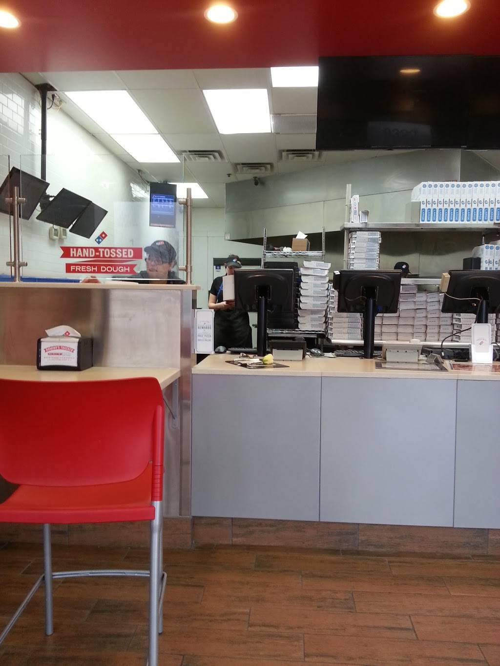 This is the first time I've went to this Domino's in my neighborhood. And found it to be terribly efficient with my food hot and ready and the Pizza tracker accurate and the customer service was excellent once I walked in the door. They seemed adequately staffed the deal with Street traffic, carryout and delivery. This Dominos was clean and well-maintained and again I like the fact that they were ready to deal with some of us who were ordering pizzas for the football game it did not seem overwhelmed by it.