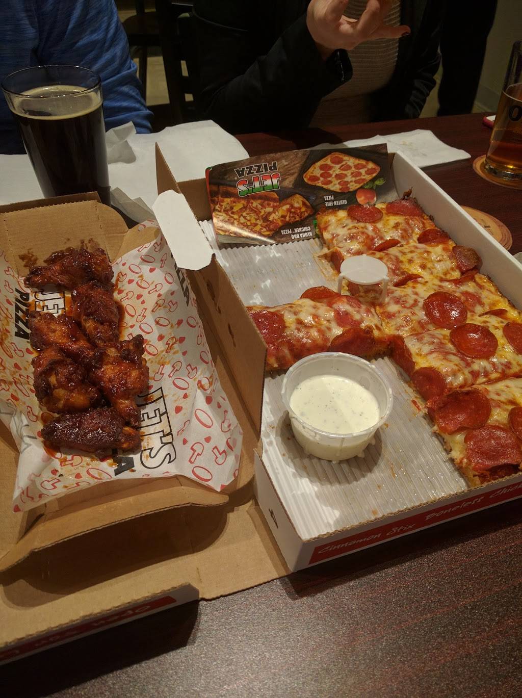 Love Jets! Had no idea what Detroit Style pizza was and almost didn't even try it because it's a deep dish. But my god is it delicious. The crust is crunchy and delicious, especially with there "turbo crust." Staff is always friendly when I come in, and they clearly do a lot to support the community they are in, with a lot of photos of local high school sports teams as evidence.