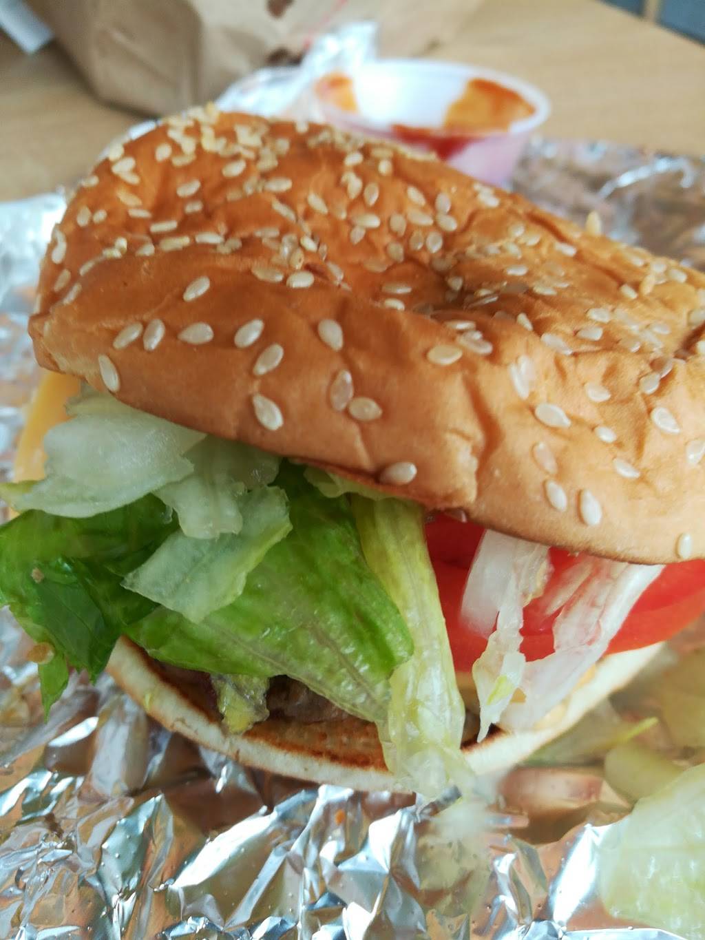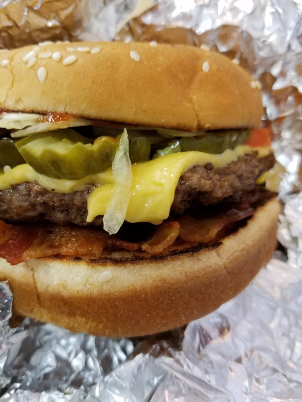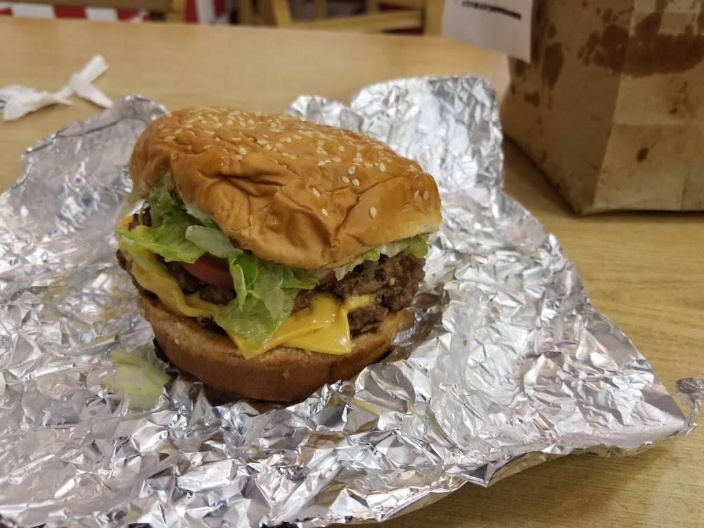 5 guys is always good. You know what to expect if you've been to one. They're consistent and tasty as heck. Get the little version of fries (and likely burgers) as they put a cup of fries in the bag alongside the small cup filled with fries.