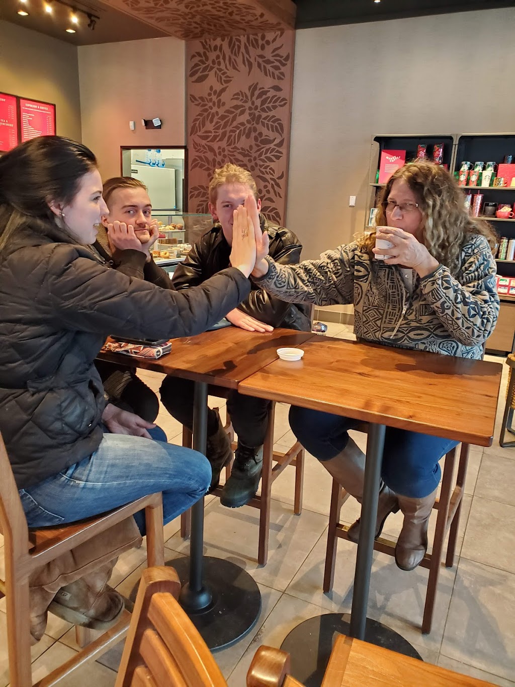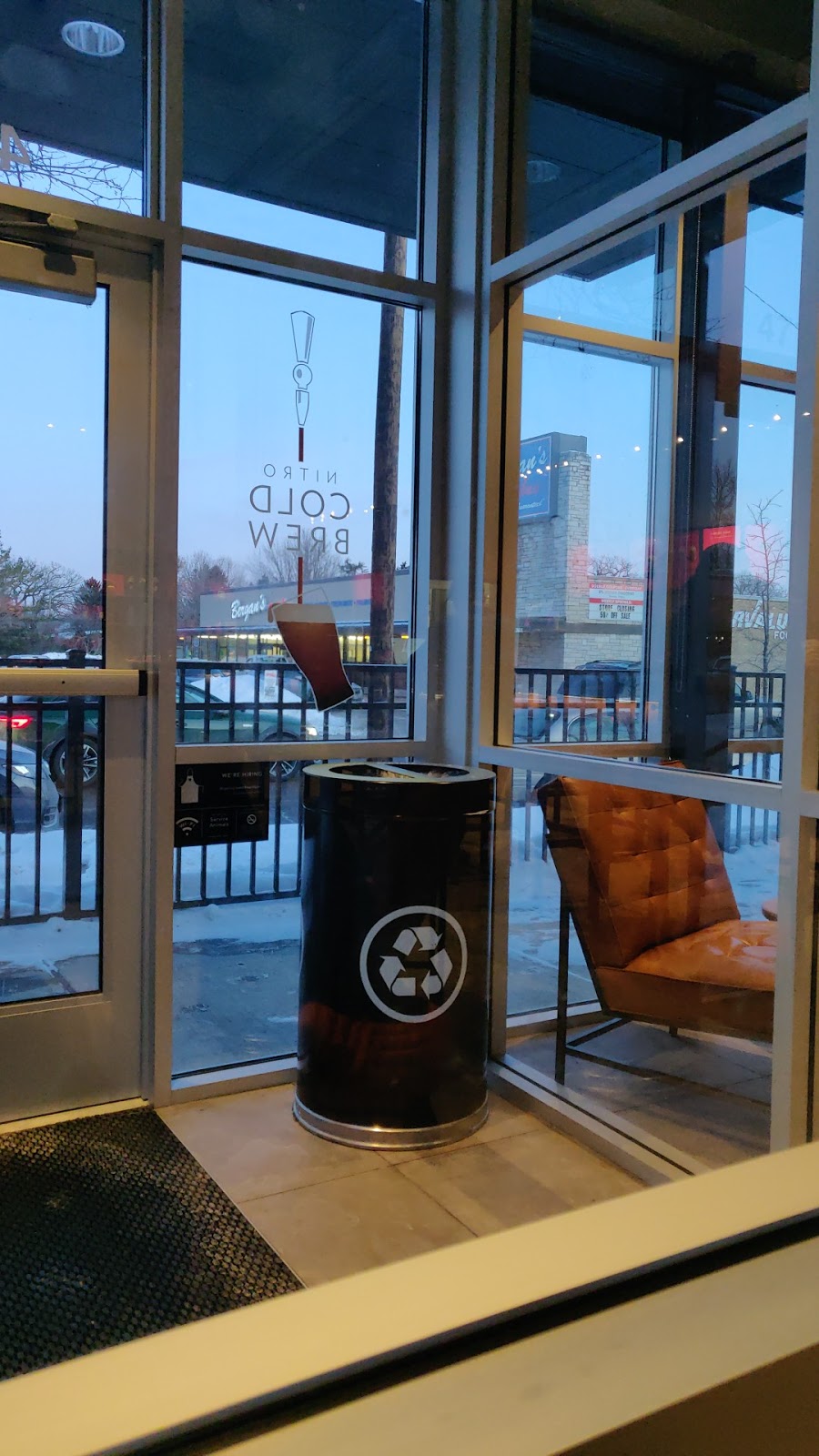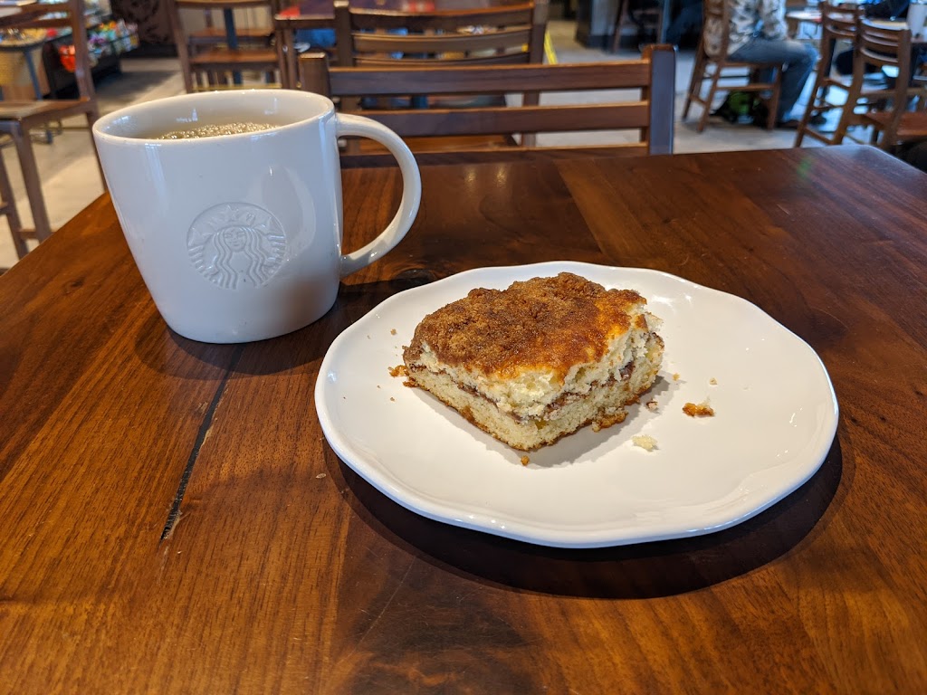I stopped here after having a treacherous morning and I was greeted by friendly staff all around. Vintage like furniture and bar stool seating made this Starbucks cute. Stairs walking up to the the main entrance but the parking lot has wheel chair accessible entrance as well.