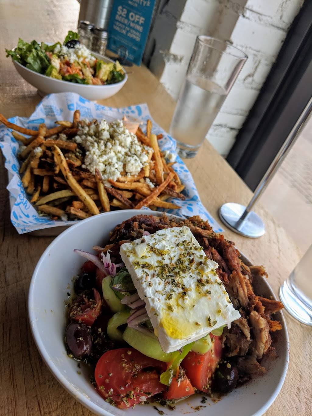 Amazing food, wonderful staff and prices were right on point. It was our first of many visits and the overall experience did not disappoint. We had the pork pita which was delicious, the lamb kabob, Naughty Fries and baked feta with honey. All of it was wonderful and had authentic Greek flavors. We didn't get a photo of the Pork pita or baked feta (kids dug in way too fast)