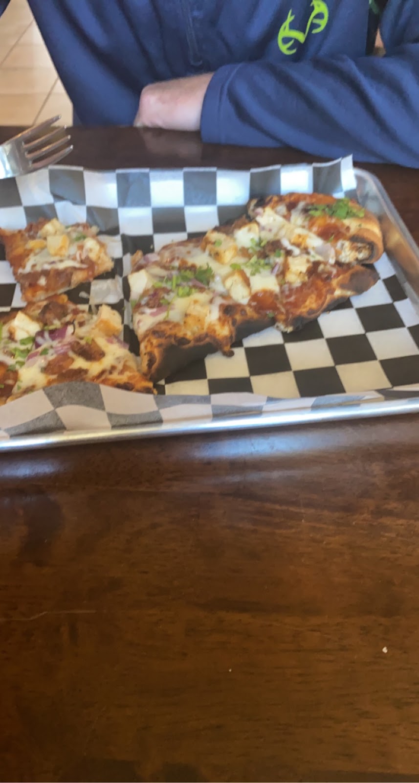 We enjoyed the chicken with white sauce pizza on flatbread. It was delicious.