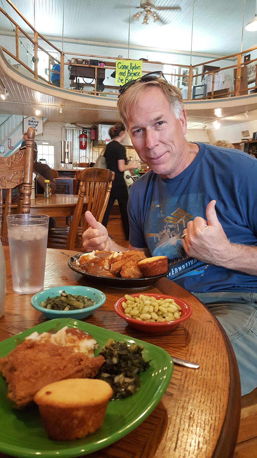 The Jalapeno cornbread is what they mean when they say " hot corn bread " and it's oh so good!!! Hot fresh fried chicken, butter beans, mashed potatoes and gravy was just like your grandma used to make and the atmosphere is like a big family reunion. Everyone sitting at a table, drinking iced tea, chatting it up enjoying good fresh hot food!!! True southern comfort and atmosphere!!!