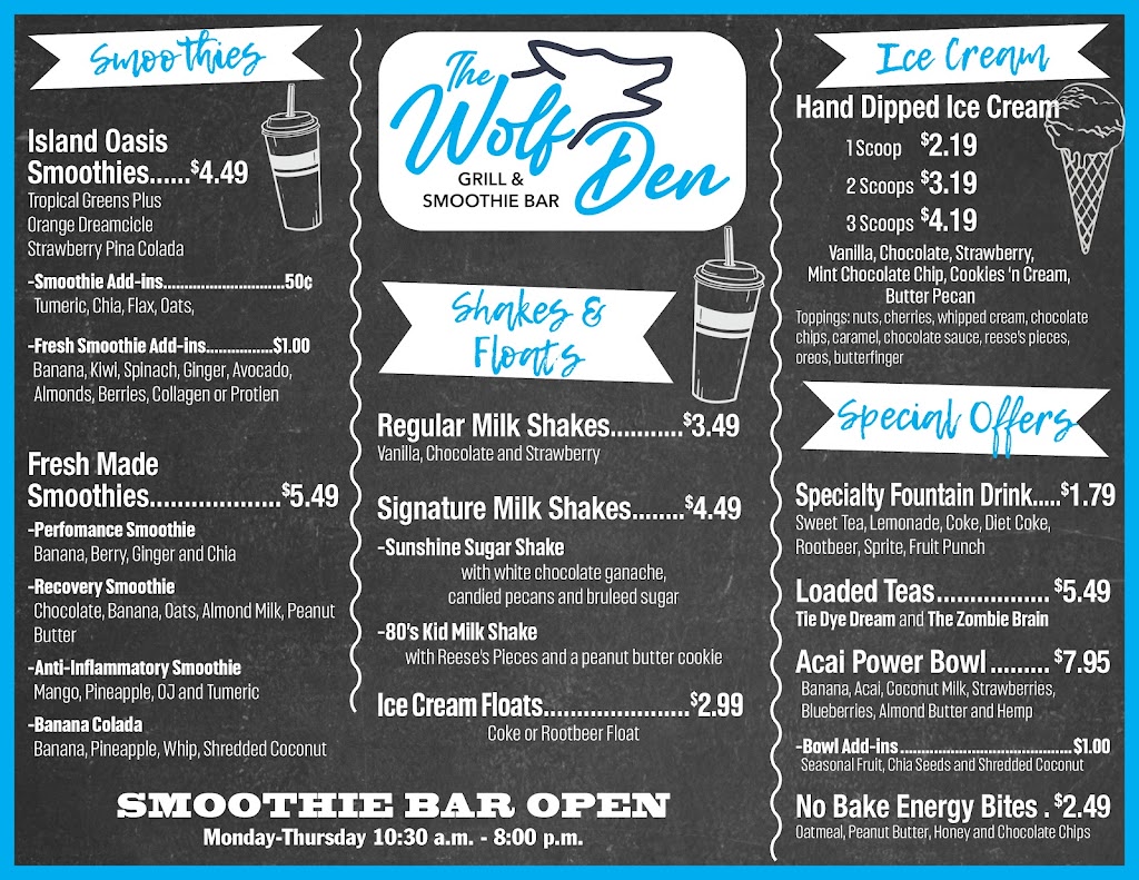 You can review this Business and help others by leaving a comment. If you want to share your thoughts about The Wolf Den Grill and Smoothie Bar, use the form below and your opinion, advice or comment will appear in this space.