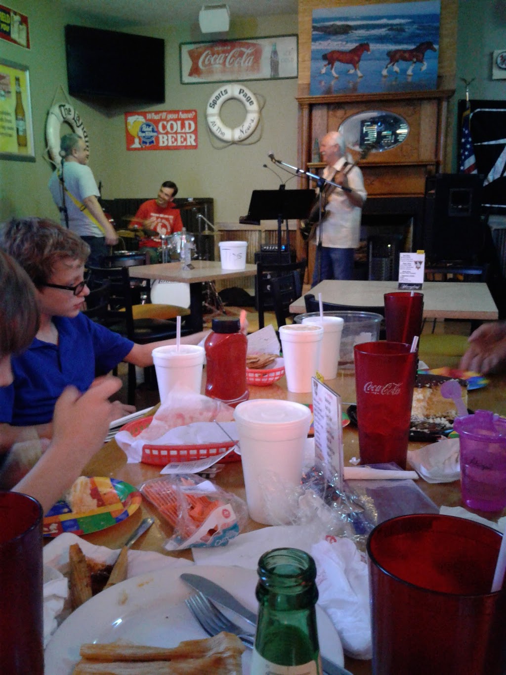 Was kind of high 4 small weak captain Morgan and cokes 1 ice tea and a 5.99 fried pickles came to 58.00 the band was great Jeff Holland
