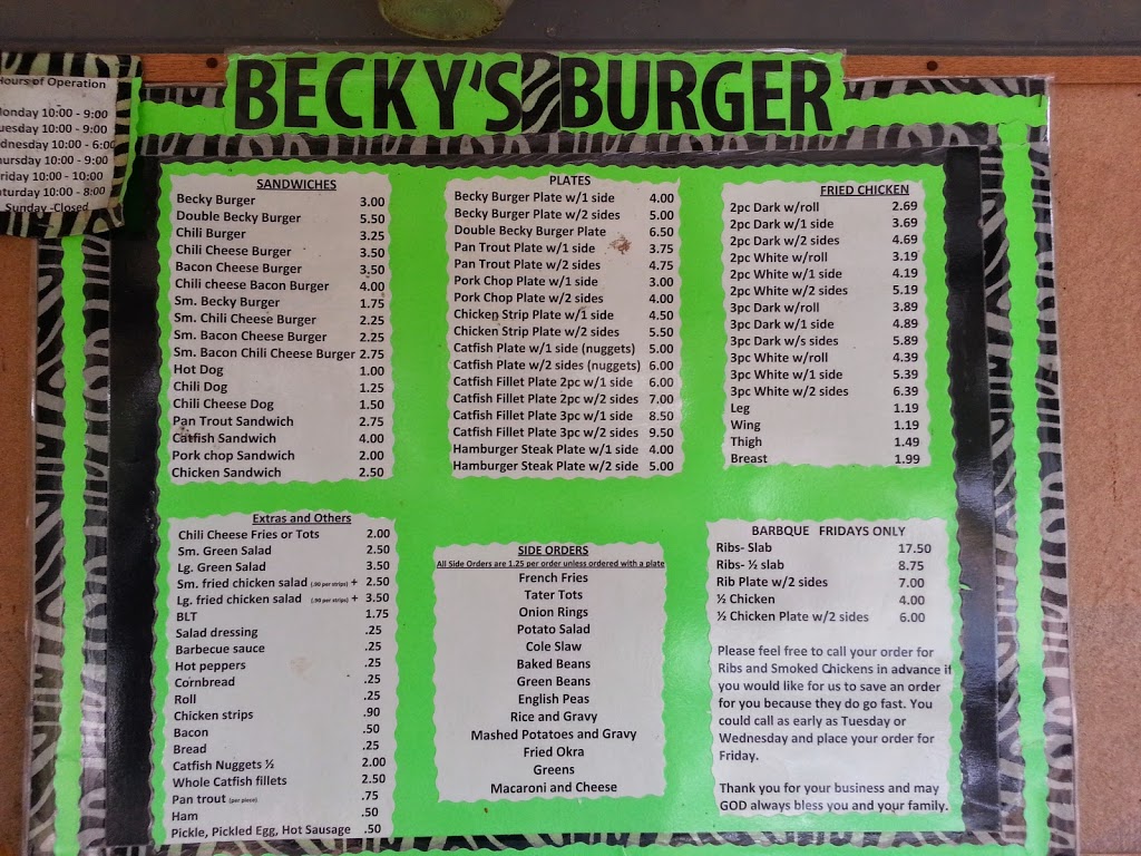 This place is a secret and it’s a gem only told by “word of mouth” amongst the Simpson County natives. If you’re fortunate and lucky enough to taste of the food from this place you’re one of the fortunate ones. I would highly recommend this over any of the other place when it comes getting one of the best hamburgers for the price. Trust me!! Thank You Becky’s of Magee Mississippi!!! It’s just across the street from the Piggly Wiggly in the neighborhood right there by the school you’ll find it it’s quick off 49 and it only take you 15 minutes and you’ll be back on Hwy 49 eating your food going down the road. It’s worth the wait you’ll get through there faster and you will at McDonald’s I promise.
