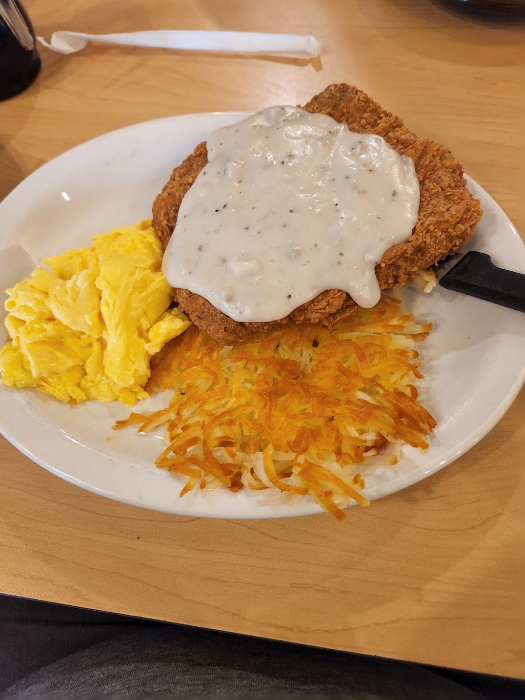 The atmosphere was great with a variety of choices of places to sit to accommodate my friend who had a total knee replacement. The service was excellent and very friendly. The food was wonderful. I had the 1/2 lb chicken fried steak meal with hash browns and 3 hot cakes with blueberries and whipped cream. Plenty to take home for another meal!!! Really can't say good enough about this place!!! Decent prices too!!!