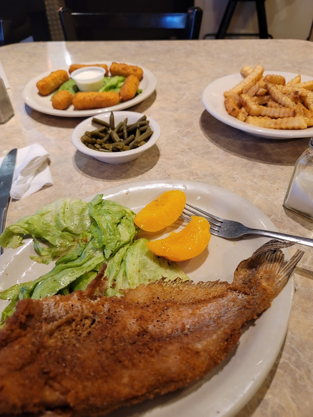 My Chicken Fried Steak dinner - meat was very small, and I think it might have been crispy when it was first pulled from the fryer, but it was covered with SO much gravy, it was very soggy. The gravy and mashed potatoes were about the same consistency so I really don't know how much of either I had on the other side of my plate. Vegetables were canned and very overcooked.