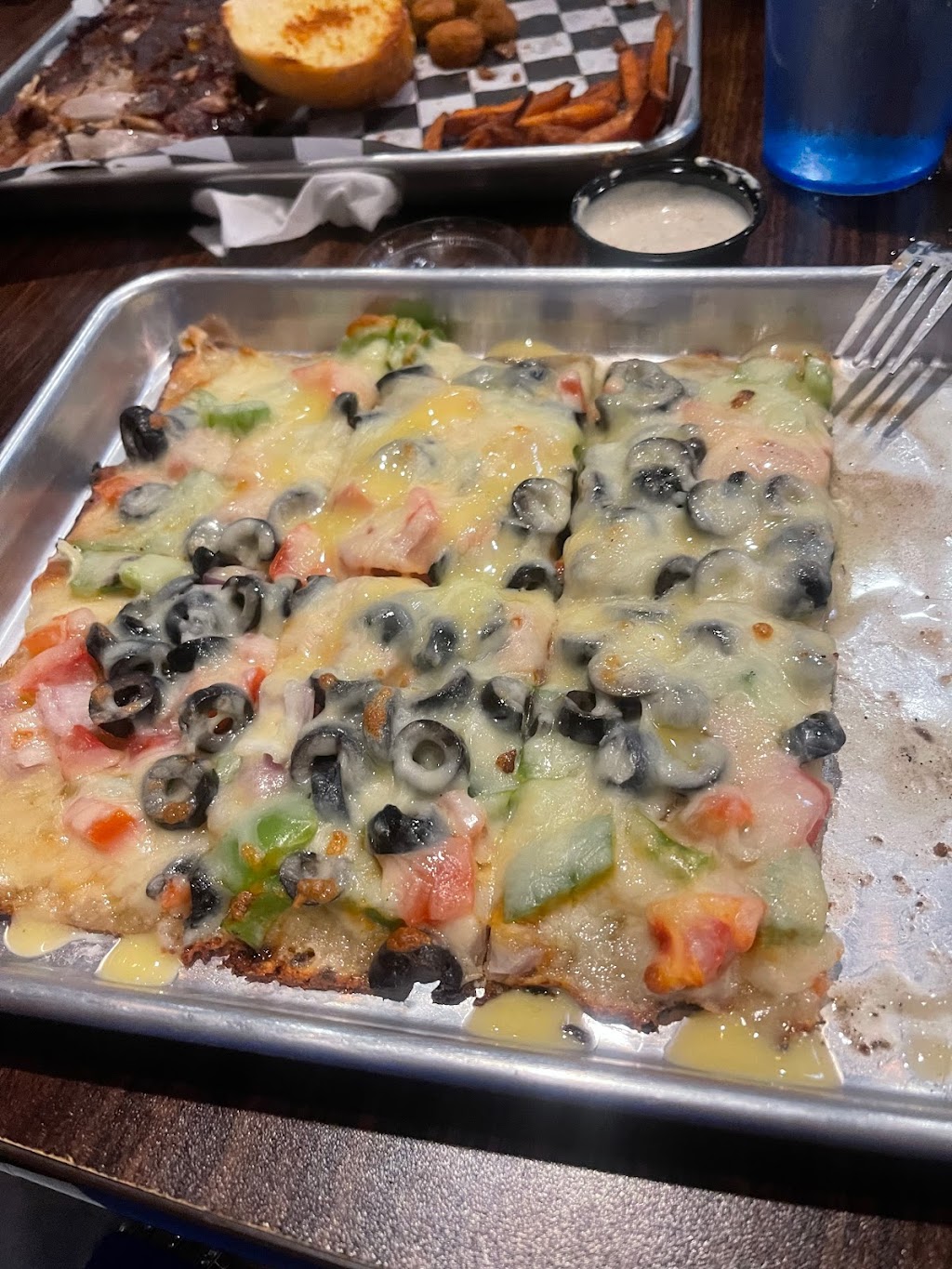 I ordered a half rack of baby back ribs with two sides and garlic bread for $18. They have a lot of great options for sides – I got fried pickle spears and jalapeño mac bites. My wife got the spicy steak sandwich for $16 which included a 6 oz filet mignon and jalapeños on a sandwich with a side (she got sweet potato fries) for $16. Everything was delicious, including the BBQ sauce options. We didn’t get dessert but their dessert options sounded good, especially the fried cheesecake.