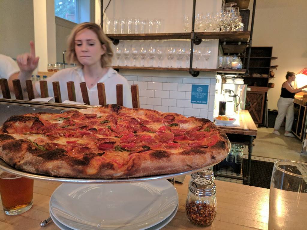 The restaurant has seating at the nice sized butcher block looking bar and some tables as well. The place is quite small so you may have to wait to be seated. The atmosphere is clean & simple; the wait staff friendly & efficient. We were there for dinner which consists of 18” pizzas and several appetizers. We opted for salads & pizza. Our Italian & Caesar side salads were fresh and flavorful. We had the Classic pizza (tomato, mozzarella & basil) and red wine. Hands down a superbly crafted pizza. They give you one of several dipping sauces for the crust. We only ate half of the pizza & they boxed up the remaining half. For dessert they had large chocolate chip cookies which were delectably soft with plenty of chocolate melted chips. This went great with the perfectly brewed coffee I had. Also, purchased a couple of loaves of their fresh baked bread.