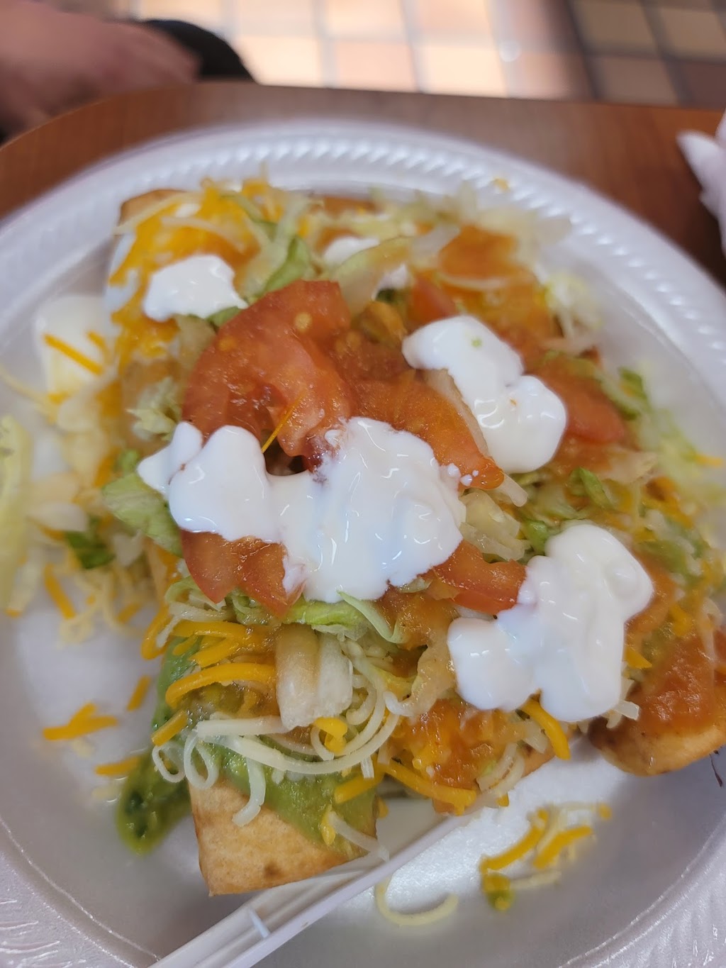 Our first visit to this restaurant was interesting. Us and another couple ate supper on a Monday evening, around 7:30 p.m. There was one other table of people, so not busy. We ordered and received our food within a few minutes. Every order was an enormous amount of food. The quesadilla, the fajitas, the burritos, everything with a tortilla had, what looked like, a 15" homemade tortilla. They were huge, so you can understand how every order was just a whole lot of food. All the meals were served on Styrofoam plates, although I'm not sure exactly what would have worked better for a fast food restaurant. It was just odd to have so much food piled up on flimsy Styrofoam. The table and bench seats were clean, but if you looked close, where the table met the wall and the edges of the table, it was chunky dirty; and the women's restroom was not very clean.
