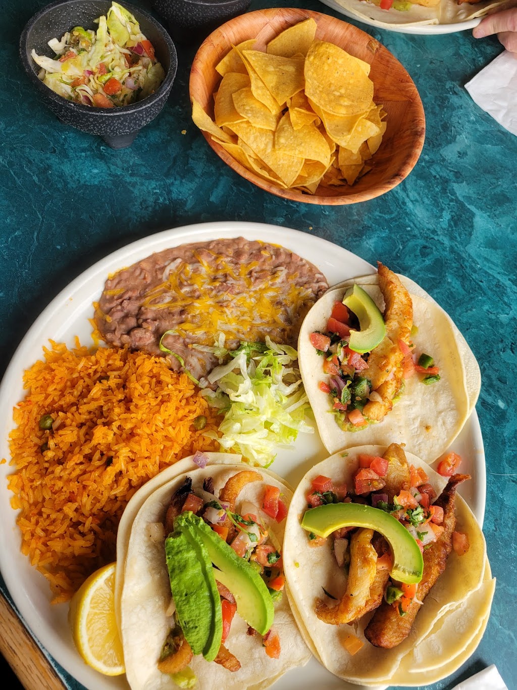 I ordered the fish tacos for lunch here and Holy wow! The plates are HUGE and the tacos were perfect. They gave 3 large tacos rice and bean's. The playe was more of a platter and the food was amazing! Definitely will be back for more delicious food. Oh they bring chips that are warm with salsa and another dip that's also super yummy.