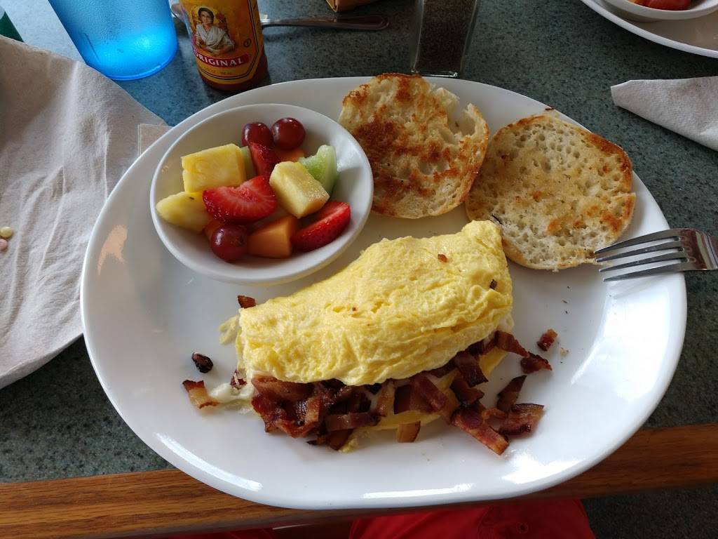 Service was great. View is absolutely spectacular great outside eating and bloody Mary's. Food is basic but fine
